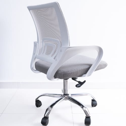 Equipada con rodachines de nylon de alta resistencia y una base cromada de 5 puntas de 60 cm de diámetro, proporciona estabilidad y movilidad suave en todo tipo de superficies. Su mecanismo basculante permite ajustar el ángulo de inclinación para mayor comodidad, mientras que los brazos fijos de polipropileno y el soporte lumbar fijo brindan un apoyo adicional.